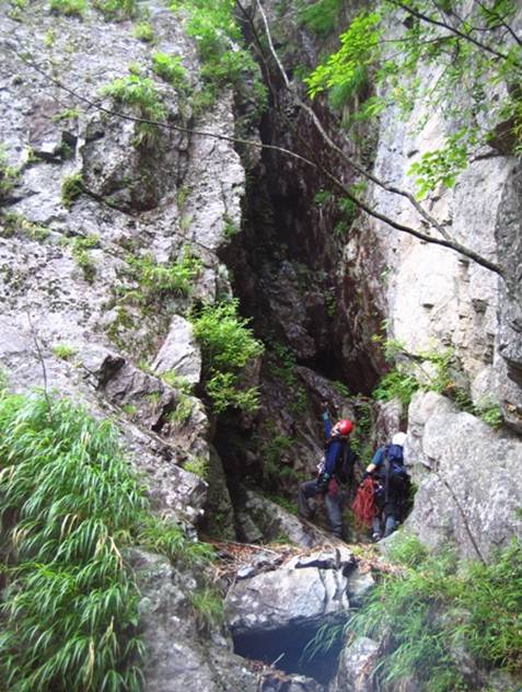 今回の山行のことを考えながら下る。 この沢は河原がない、沢全体が一本の滝のようなものだった。 流程は短いが、非常に中身の濃い沢だった。 振り返えり、佐藤さんと福島さんを見ると満足そうな顔をしていた。