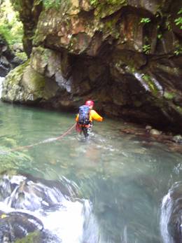 お助けロープを持って泳ぎ何とかホールドまでたどり着く。 淵の落ち口を登ろうとするが、水圧で吹っ飛ばされそうになった。 こんなに流れがきつかったのは初めてだ。 なんとか這い上がりお助けを流そうとすると 福島さんがザイルを引いて後に続いて泳いできた。 さすがだ!