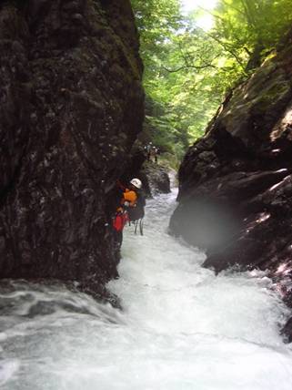 犬戻り淵でラッコ泳ぎの練習をし、落ち込みの上を渡渉する。